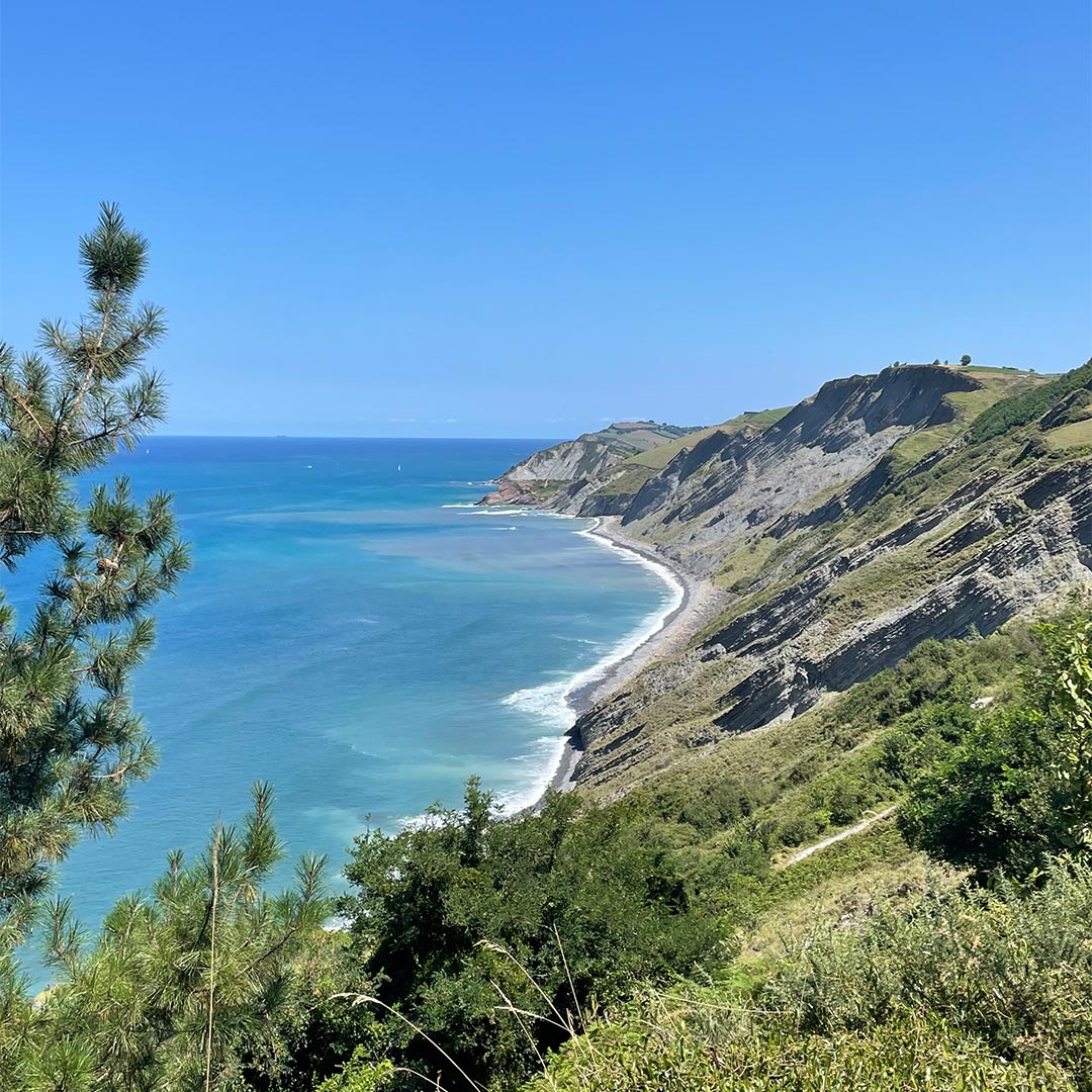 The hikes were phenomenal: green and a landscape with deep rolling hills. We took a hiking tour from the top of the cliff, where we were staying down to the ocean. Awesome! We just miscalculated the wave power; it differs slightly from paddling in the Mediterranean. In the evening, we were a little sick from drunk seawater, but oh well, everything was cleaned up for us, so the suffering was small. It's named Deba; GPS N 43.28820 W 2.28652